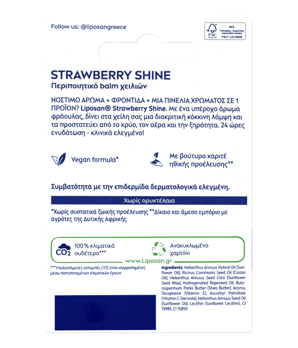 Το Liposan φροντίζει τα χείλη και σέβεται το περιβάλλον. Το Liposan STRAWBERRY SHINE είναι κλινικά ελεγμένο, αποτελείται απο 99% συστατικά φυσικής προέλευσης χωρίς ορυκτέλαια. Συμβατότητα με την επιδερμίδα δερματολογικά ελεγμένη.